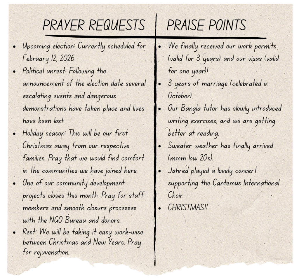 As time goes on our dreams, desires, and expectations for what life, work, and ministry will continue to look like here constantly shift and change. We acknowledge the reality that most Bangladeshis live in an extremely urban environment and with that comes many western accommodations/ comfortabilities – by engaging in some of these things we are having no less of a Bangladeshi experience than if we were to avoid them.